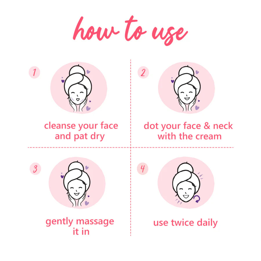 Apply evenly onto skin and gently massage with fingertips, in slow upward-outward circular motion. don't forget the neck area